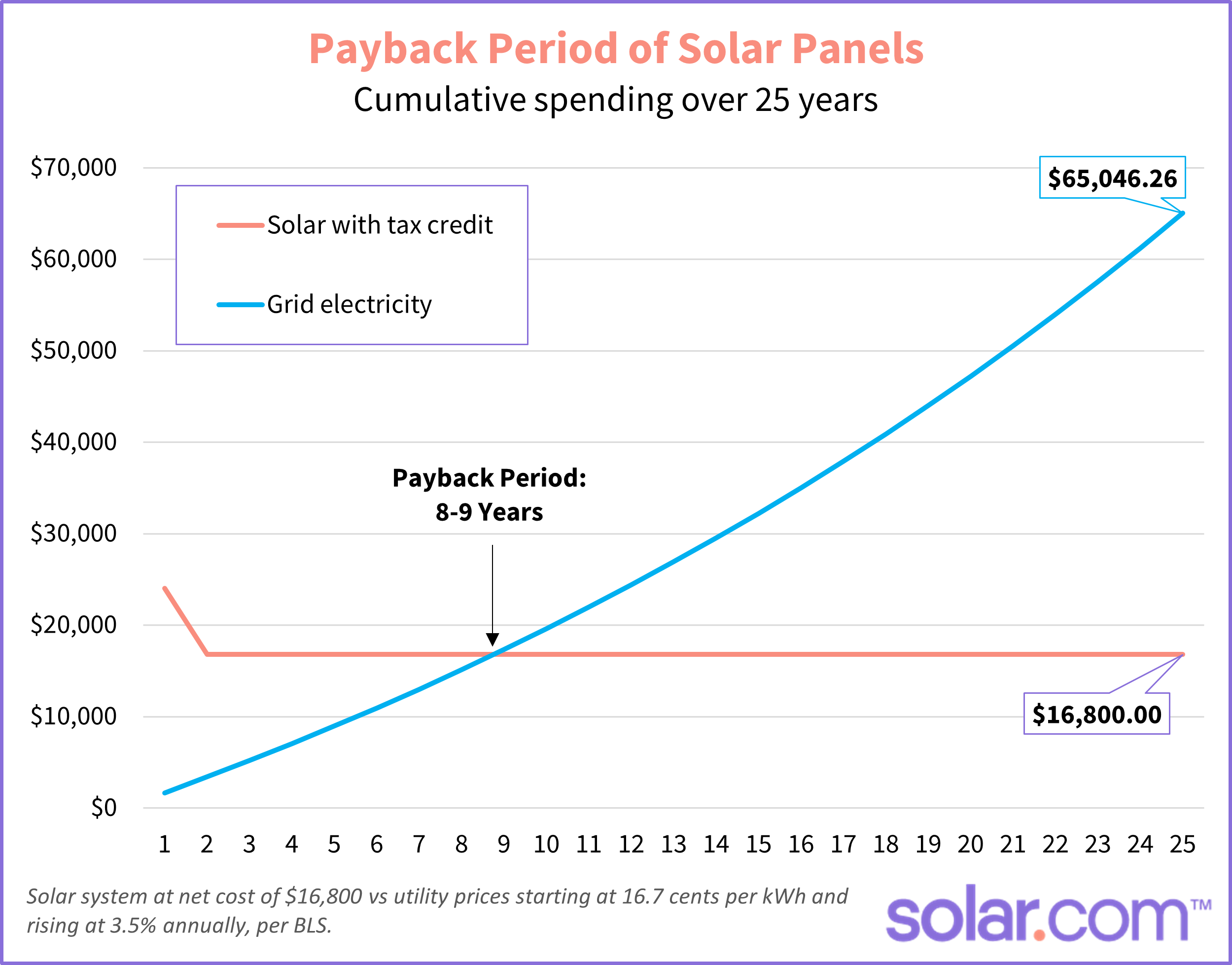 The Financials: Solar panels typically pay for themselves in seven to nine years, depending on your local electricity costs. After that, your power is virtually free. If you have “net metering” with your utility, you can sell your excess energy back to the grid, further reducing your bill and helping power your community.